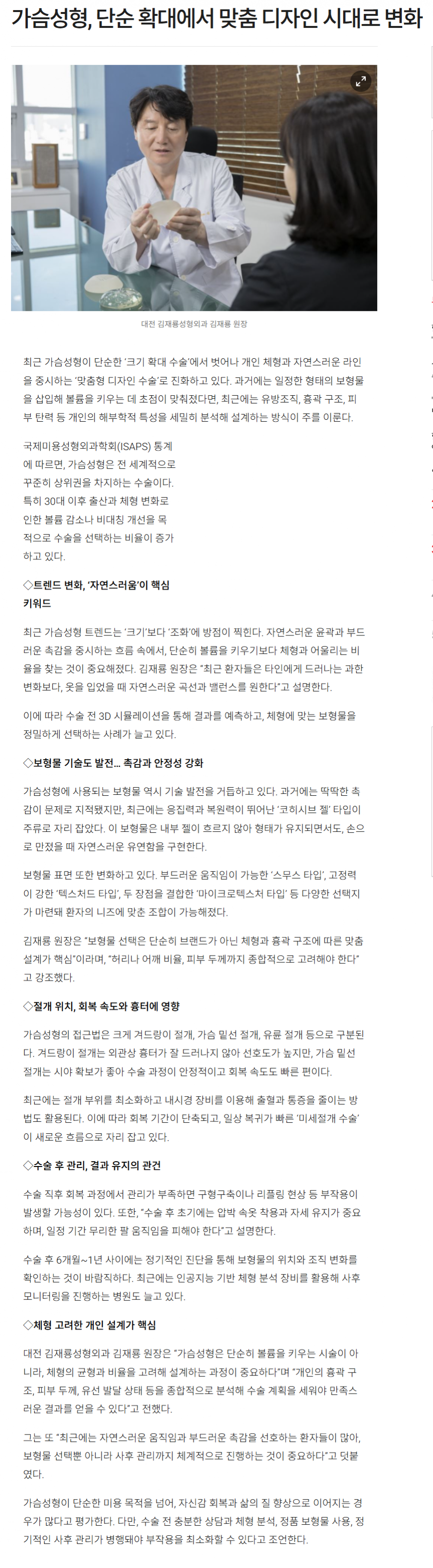| 14 | [언론보도] 가슴성형, 개인 맞춤형 가슴 수술ㆍ확대.. | | 2025.09.02 | 10,223 |